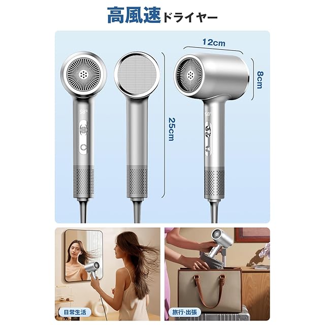 商品名:ドライヤー 大風量 速乾【2025最新型・6億高濃度マイナスイオン】 ヘアドライヤー ブラシレスDCモーター NTC温度制御システム 過熱防止 静電気除去 美容師監修 PSE認証済み 日本語説明書付き 出張・旅行用/家庭用/サロン用 シルバー