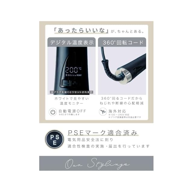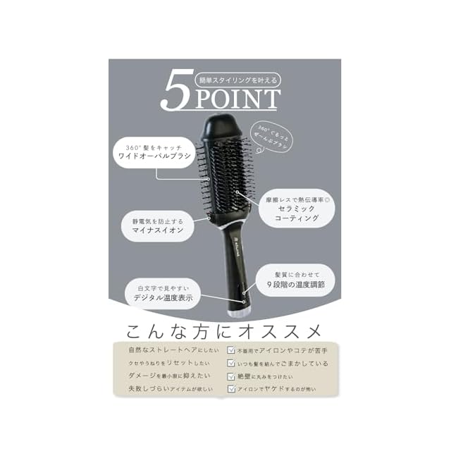 【5Pointで簡単スタイリングを叶える】・360°髪をキャッチワイドオーバルブラシ・摩擦レスで熱伝導率◎セラミックコーティング・静電気を防止するマイナスイオン・髪質に合わせて9段階の温度調整・最後の温度を保持する設定温度メモリー【こんな方にお勧め】・自然なストレートヘアにしたい・くせやうねりをリセットしたい・ダメージを最小限に抑えたい・失敗しづらいアイテムが欲しい・不器用でアイロンやコテが苦手・いつも髪を結んでごまかしている・絶壁に丸みをつけたい・アイロンでヤケドするのが怖い