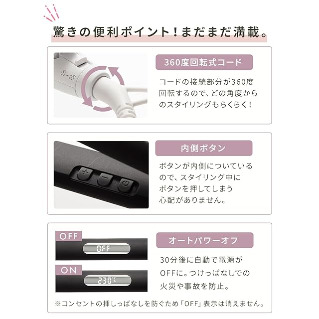 ✅【 30段階 温度設定 】80℃~230℃まで5℃間隔で30段階の設定が可能。スピードヒーター搭載で忙しい朝でもあっという間に使用可能温度に到達します。温度上昇確認モニターで1℃ずつ温度上昇を確認できて便利! サロン用 として プロ の 美容師 さんにも 人気 です。 ✅【 海外対応 】100V~240Vまで対応しているので、海外 でも使用できます。※変換プラグはご用意ください。✅【 持ち運び にも】ロック機能搭載で コンパクト に 収納 ができます。旅行 などの持ち運び にも便利です。
