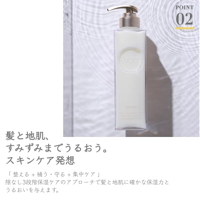 ①スキンケア発想〜髪と地肌、隙なし3段階まとまりケア〜 「整える+補う・守る+集中ケア」 ②96%以上*1美容液成分+シールド成分※1 ③肌プロテクト成分※2配合。髪と頭皮のうるおいを守りながら洗い上げ、バリア機能をサポートします。 *1 基剤を除く、水を含む ※1 加水分解ハトムギ種子、ポリクオタニウム-61、白金(全て保護) ※2 アルガニアスピノサ核油(保湿)