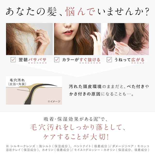 ②吸着&保湿効果のある泥※1配合でかろやかするん髪へ ※1海シルト(保湿成分)、ベントナイト(吸着成分)