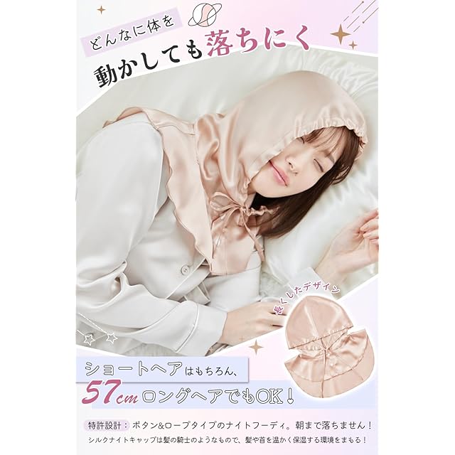 【朝まで脱げない・シルクナイトキャップ】ナイトキャップにフードデザインを採用し、ボタンを追加しました。ひもデザインにより、使用者の要望に合わせてサイズ調整が可能となっております。髪をしっかり包み込み、寝返りをしてもズレることがありません!また、製品の後ろの着丈部分が少しだけ長くデザインされており、ショートヘアの方だけでなく、57cmほどのロングヘアの方でもしっかりカバーできるようになっております。