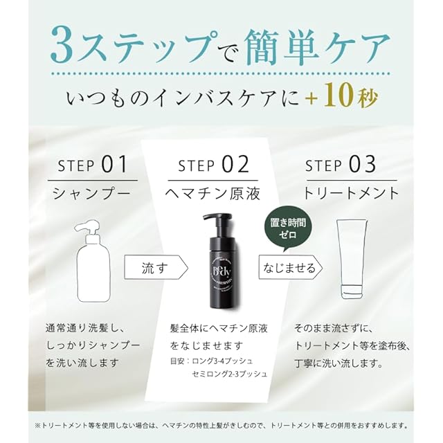 【ヘマチン配合で髪のダメージ補修】髪内部に浸透し、カラーやパーマ、紫外線によるダメージを補修。ツヤとハリのある髪へ導きます。