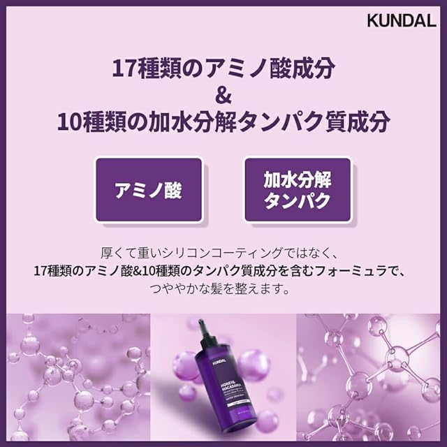 厚くて重いシリコンコーティングではなく、17種類のアミノ酸 & 10種類のタンパク質成分を含むフォーミュラで、つややかな髪を整えます。
