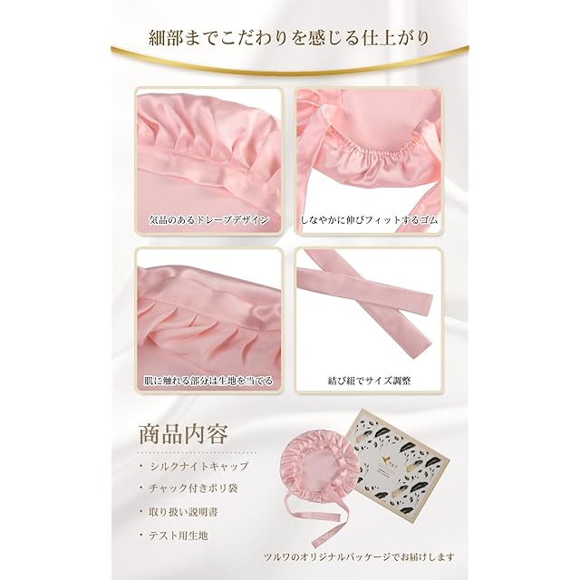 [ツルワ] ナイトキャップ 6Aクラスシルク100% 19匁 ヘアキャップ お休みキャップ 美髪 摩擦軽減 頭皮保湿 ツヤ髪 就寝用 産後用 紐付き サイズ調整可能 ロングヘア対応 (ピンク, M)