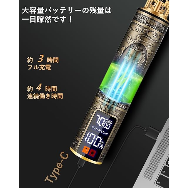 【LEDディスプレイ付き&USB充電式&お手入れ簡単】 電動バリカンにはLEDディスプレイが搭載されており、ばりかんの充電状況、スピードレベルと使用状況充電状況は一目瞭然で、もっとよく散髪することを対応可能です。Type-C充電式で、1回の充電で最大240分の連続使用が可能です。充電式で、コードレス、小さくて軽く、持ち運びにも便利なので、家族、旅行、ビジネス、どこでも使いやすいです。バリカンの刃は水で洗うことができ、刃や体に付着した小さなゴミを落とすことができる掃除ブラシも付いています。 充電口はバリカンの底にあるので、全身を水洗いすることはできない。