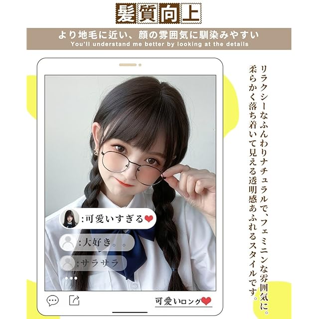 【ウィッグ素材】①高品質ファイバーを採用してウィッグの特別なテカリがないです。髪質がサラサラして本物のように違和感ないです。 ➁160 ℃までより高い耐熱性のあるファイバーを使って、コテ、アイロン、ドライヤーで好みの髪型に整えることができます。 ➂地毛より良い静電気に抑制効果がある。