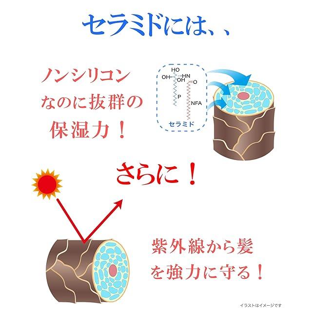 95%以上がトリートメント成分で作られたヘアミルクなので、ベタつずサラサラなのに潤いのある滑らかな髪に仕上げてくれます。秘密は3種類の『セラミド成分』。たっぷり配合されたセラミドが髪の水分を蓄え、潤いを保ちます。