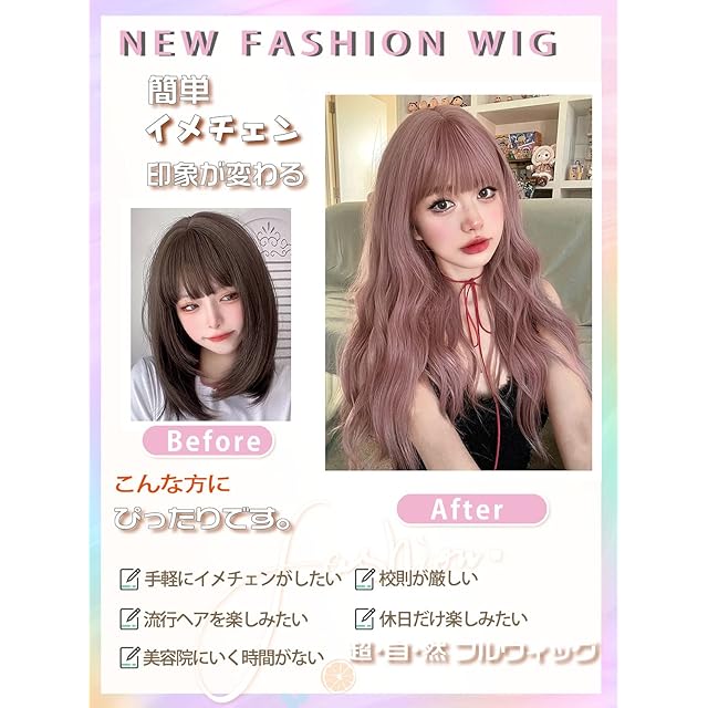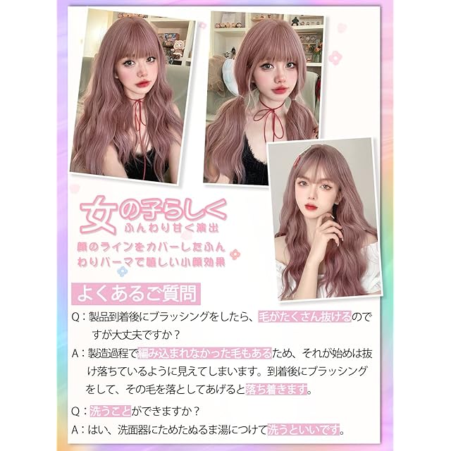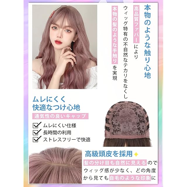 【ウィッグサイズ】:①前髪:つむじから約13CM,後ろ髪:つむじから約55CM。②頭周り:最大約56~58㎝、アジャスター付きなので、個々の頭の大きさに合わせて段階調節することができます。③カラー:ピンクアッシュ④素材:高品質耐熱ファイバー。⑤同梱内容:ウィッグ/ウィッグネット/日本語使用説明書。