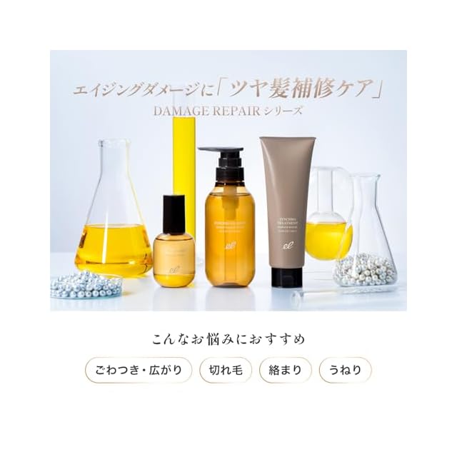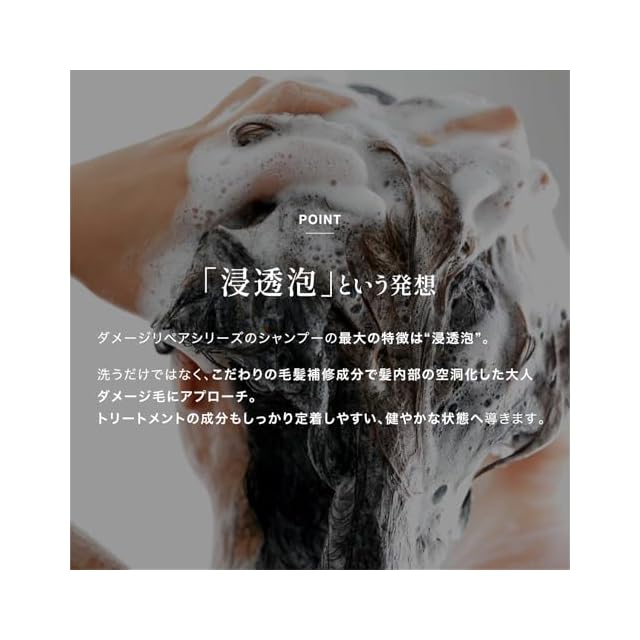【空洞化*した毛髪をケアする浸透補修成分】ダメージにより損傷した部分を補修し、脆くなった髪を芯からしなやかに導く内部補修成分に加え、髪表面を保護するコーティング成分で強く美しい髪を叶えます。 目には見えない外的刺激から毛髪を保護しながら、潤いを与えしっとり艶やかな髪へ導く補修成分を配合しました。