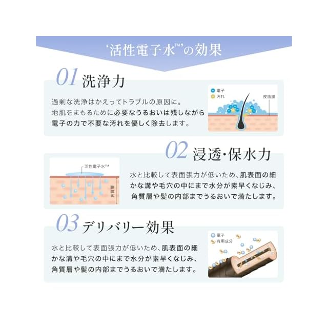 【浸透泡という発想】ダメージの蓄積が顕著な方は頭皮環境が乱れてしまっていることも多く、やさしい洗浄成分を使用したシャンプーで頭皮をいた労わることが推奨されます。 ベースに活性電子水を配合することで、電子の力でやさしく汚れを吸着・分離し、優れた洗浄力を発揮しながら、頭皮や髪にうるおいと補修成分を与える“浸透泡”を作り上げることができます。