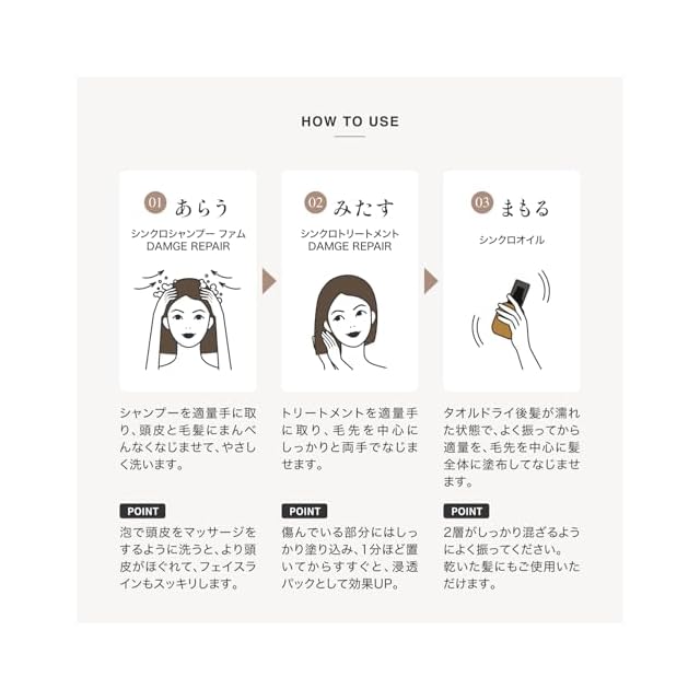 【シャンプー&トリートメント サロン級ケア方法】①髪・頭皮を予洗い後、シャンプーを手に取り、1度目の洗髪をします。②2度目はシャンプーをたっぷりと泡立て、頭皮や髪を覆うように3分間泡パック後洗い流します。③水気を軽く絞り、全体的に丁寧にトリートメントを塗布し、ご自宅にあるコーム等でまんべんなくなじませます。なじませた後は、1~2分程置いてから洗い流すと、指からすり抜けるように滑らかな仕上がりに。