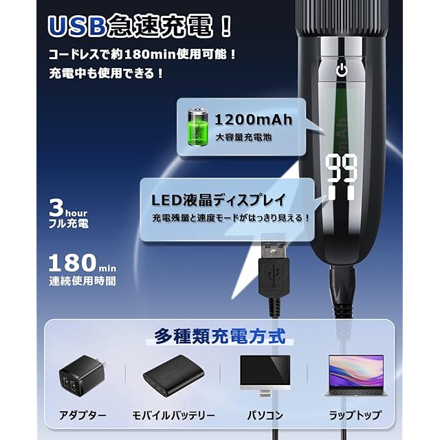 【大容量バッテリー&充電しながら使用】大容量バッテリーが搭載され、大容量1200mAhバッテリー搭載され、3時間のフル充電で180分連続使用可能です。コードレス式なデザインは出張先旅行先への持ち運びも便利です。一回充電するだけで数回使える、家庭用はもちろん、コンパクトなサイズは小さい収納バッグに入れて出張先·旅行先での使用も便利です。コードレス式で、万が一充電を忘れた場合、偶に付属の充電ケーブルに接続し充電しながら使用可能。※電量表示は2桁の数字しか示さない、99はフル充電を示す。
