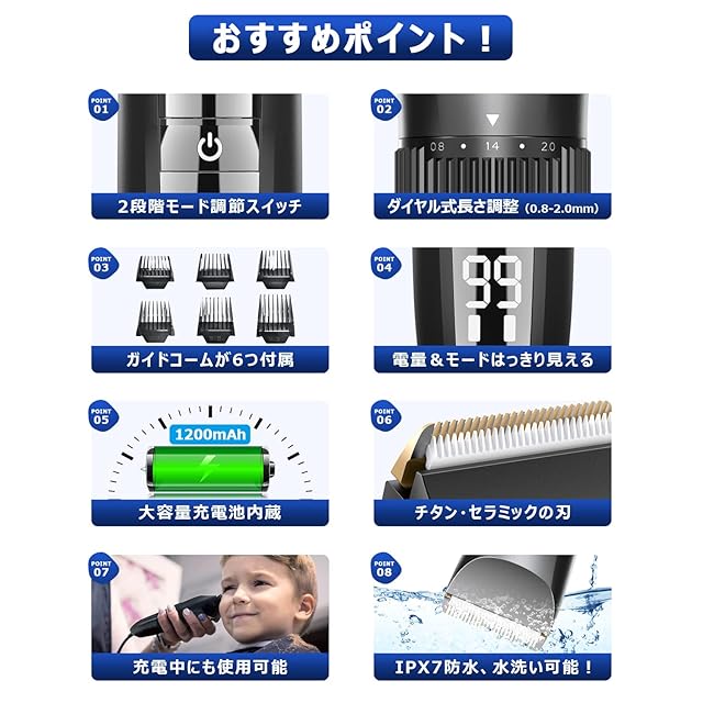 【切れ味抜群‣肌を傷つけない】強力モーターを採用し、革新的な動力調節システムによりパワー不足の問題を解決し、切れ味抜群。刃はチタン合金製とセラミック製の二重構造で、錆びることなく、安全安心なR面取り刃デザイン、お子様の繊細な肌に傷つかない。刃は自動研磨システムで、切れ味が長持ち、髪をひっかかずにスムーズにヘアカットできる。うぶ毛もきれいにカットでき、髪の毛の量が多い方にも快適で便利に使える。※耳や肌に凹凸がある部分(コブ、傷、できものなど)に直接刃を当てない。ご注意 :潤滑オイルが付属されていませんが、ミシン油、ベビーオイル、つばき 油で代用可能です、刃の部分に 1滴ずつさして、刃が更に滑らかでシャープになります。