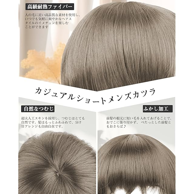 ウィッグ メンズ ショート プレミアム フルウィッグ 男装 黑髪 かつら 男性用 イメチェン wig 自然 耐? 小? 人気 紳士 ふわふわ 普段使い ファッション イケメン ふんわり ネット付 (ミルクティーグレー)