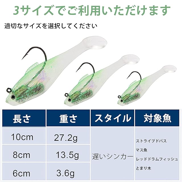 [サイズと重量]サイズは6cm / 3.6g、8cm / 13.5g、10cm /27.2gからお選びいただけます。スロージグヘッドルアーフィッシング。