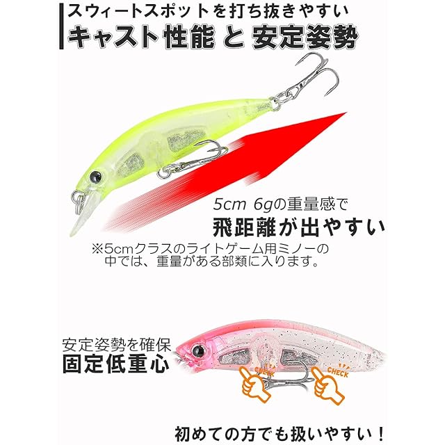 【幅広く使える】海・湖・川まで汎用性が高いライトゲーム用ミノー。/アジ、メッキ、カマスなどソルトから、ブラックバス、トラウトまで汎用性が高いサイズ感です。