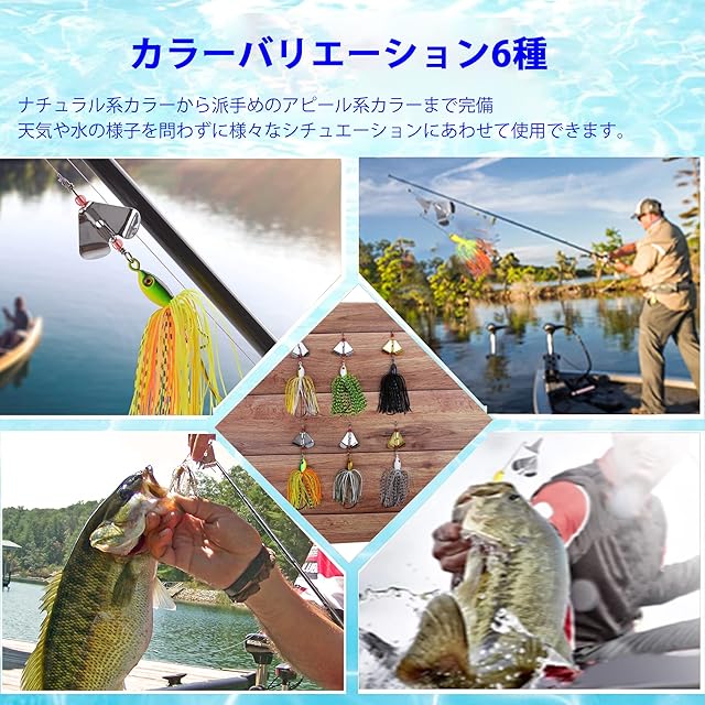 【豊富な6種色】カラーバリエーション6種展開の高コスパセットです。ナチュラル系カラーから派手めのアピール系カラーまで完備、天気や水の様子を問わずに様々なシチュエーションにあわせて使用できます。アングラーの釣りルアーにおける定番バズベイトはブラックバス、バス釣り用ベイト、トップウォーターとして欠かせない常備バスルアーと言っても過言ではないです。