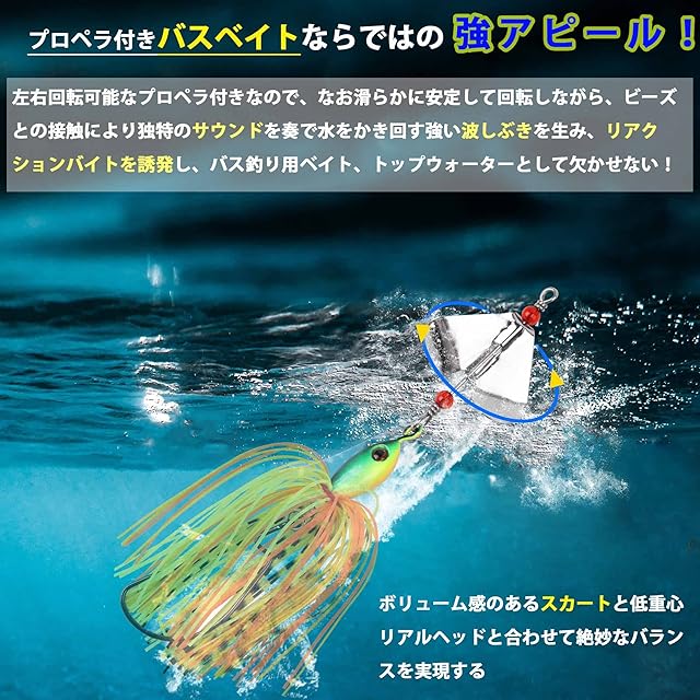【バズベイトならではの強アピール】オーソドックスなシングルセンターバランスタイプのプロペラ付きなので、バズベイトを引く際は左右回転可能です。滑らかに安定して回転しながら、ビーズとの接触により独特のサウンドを奏で、ベンチレーションのついたペラは水をかき回す強い波しぶきと引き波を生み、リアクションバイトを誘発しますから、バスベイトで素早く水をカバーし、なじみのない釣り場や低活性な時でも早めに広い水面にサーチして、素早くタナを知ったり、効率アップします!