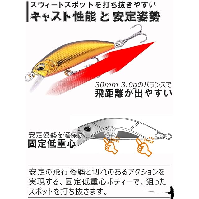 【扁平ボディミノー】 ・平打ちしやすい扁平ボディで、短い移動距離で連続アクション演出。 ・水の抵抗を受け止めやすい、若干の扇形リップでスイミングパフォーマンスを備えます。