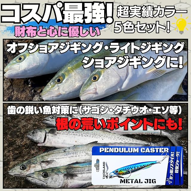 【超コスパ】サゴシやタチウオ等の歯の鋭い魚、根の荒いポイントで高級なジグを使うのは気を使いますよね。そんな方に大変オススメのルアーです!コストを落としても釣果は落としません!根掛かりの多いポイントでボトムを攻めたいという時もガンガン攻められるので、より釣果を伸ばせます。