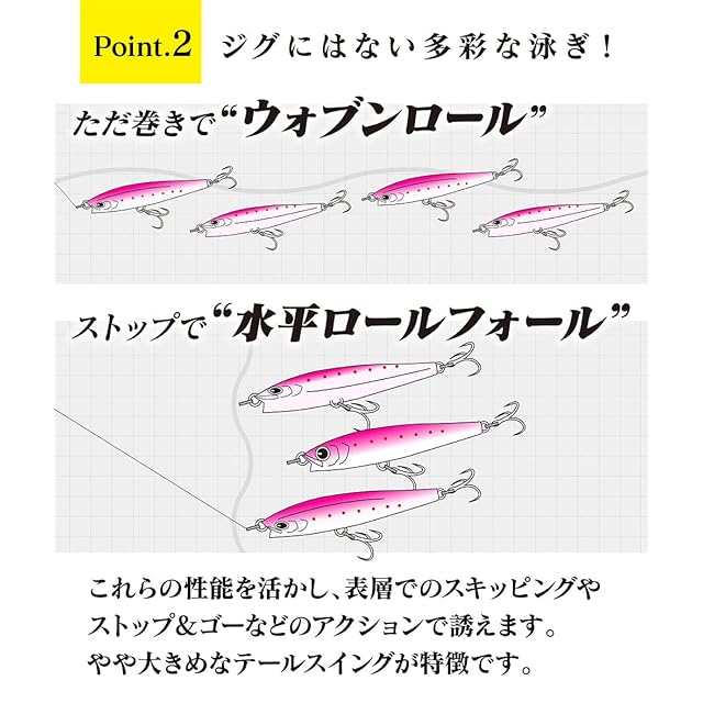 【ジグにない多彩な泳ぎ】小さなリップが水をつかみ、ジグには出来ない多彩な動きが演出できます。