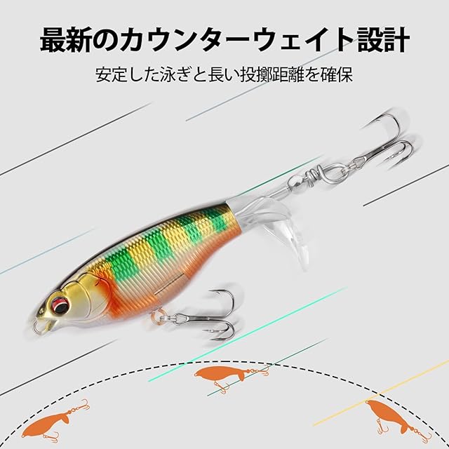 【魚が我慢できない!面白いプロップベイト】このTRUSCENDのサーフェス系ルアーは、パドルのデザインで、水面で移動する時に水しぶきを上げながらポタポタと水音を立てます。水波と水音の共の魅力で、シーバスのような捕食魚の注意を素早く引きつけることができます。また、速くても遅くても、ブレードがスムーズに回転して、水波を発生させて、魚を引き寄せます。