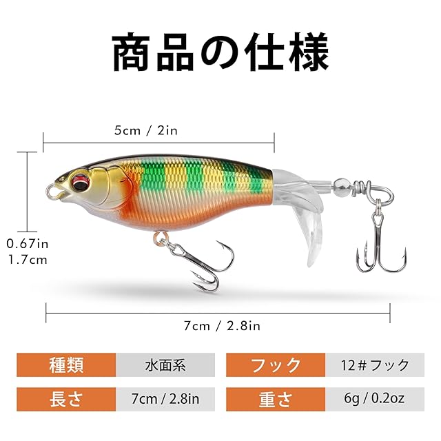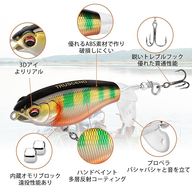 【子供でもすぐに使いこなすルアー!】このTRUSCENDのサーフェス系ルアーは、ダブルパドルのデザインで、水面で移動する時に水しぶきを上げながらポタポタと水音を立てます。水波と水音の共の魅力で、シーバスのような捕食魚の注意を素早く引きつけることができます。また、速くても遅くても、ブレードがスムーズに回転して、水波を発生させて、魚を引き寄せます。子供であろうと、初心者であろうと、プロであろうと、このルアーをすぐに使いこなし、釣りの醍醐味を感じることができるだろう。