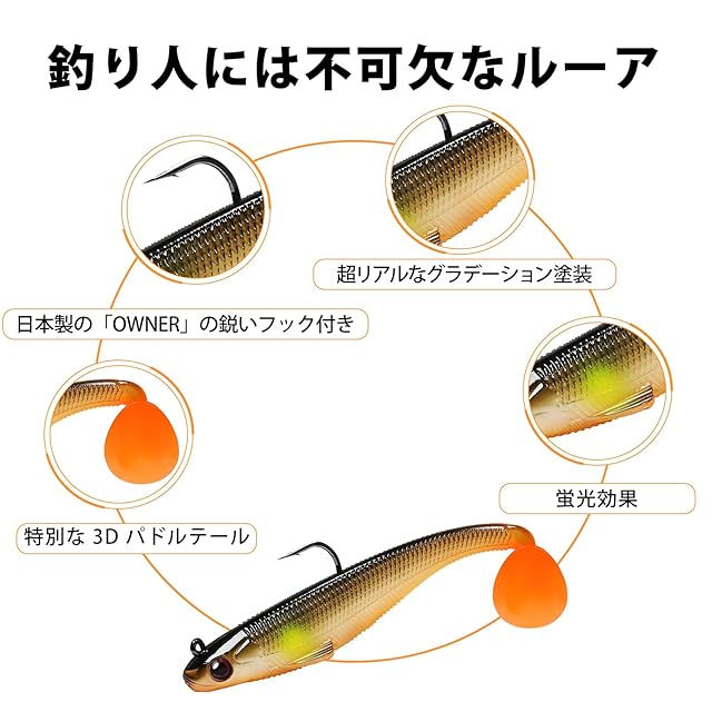 【本物を高度に復元】このソフトルアーはリアルな3D魚眼とパールパウダー塗装を備えており、まるで本物の魚のように見え、精巧で詳細な仕上がりです。「T」 字型のパドルテールは、本物の魚の尾の揺れをシミュレートし、水の波を生成します。見た目も動きも復元性が高くて、大物の注意を引くことができます。