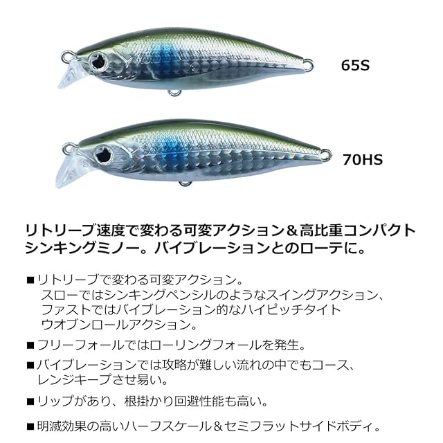 【タイプ】: 高比重コンパクトシンキングミノー【有効レンジ】: 高速時(65S:約20cm~50㎝、70HS:約50㎝~80㎝)/ スロー時(65S:約50㎝~150㎝、70HS:約70㎝~150㎝)