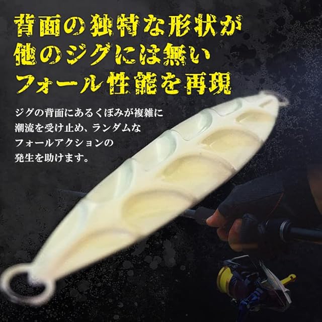 <背面の独特な形状が他のジグには無いフォール性能を再現>ジグの背面にあるくぼみが複雑に潮流を受け止め、ランダムなフォールアクションの発生を助けます。