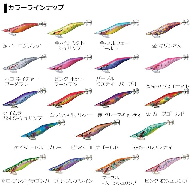 鋭いダートアクションと安定した跳ね上げを可能にする横向きラインアイ、怪しく輝いてイカにアピールするエメラルダスリアルアイ、コンパクトかつ低重心で安定したキャスタビリティとスナッグレス性能を兼備したコンパクトシンカーなど、ダイワならではのノウハウを凝縮。