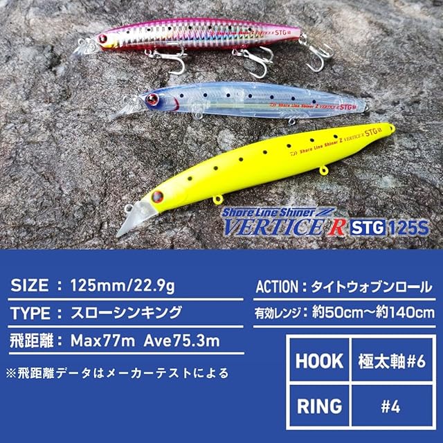 自重(g):22.9 ◆タイプ:スローシンキング ◆アクション:タイトウォブンロール ◆有効レンジ:約50cm~約140cm ◆フック仕様:極太軸#6 ◆リング仕様:#4