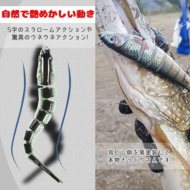 釣りジョイントルアーが7関節があって、これによってジョイントルアーはハードベイトでありながらソフトベイトなみの柔軟性を持たせられます。巻いたときだけでなく、デッドスティッキングで放置していても、ちょっとした水の動きに呼応して自発的にボディをくねらします。