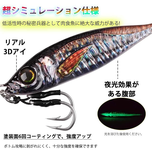 【汎用海釣りルアー】高感度鉛製メタルジグで、サビに強くて沈下迅速です。またサビに強いステンレスアシストフックだから、アクションによって海釣りや船釣りの全範囲利用できます。ただ巻きで、ウォブリングなどでターゲットにしっかりアピールし、効率的に釣りを楽しみます。マダイ、根魚、イナダ、ワカシ、ワラサ、カツオ、カンパチ、サバ、タチウオ 、ヒラマサ、ブリ、青物等に効果的です。