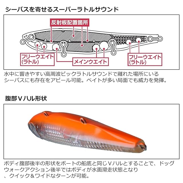 腹部Vハル形状ボディ:腹部後半の形状をボートの船底と同じVハルとすることで、ドッグウォークアクション後半ではボディが水面滑走状態となり、クイック&ワイドなターンが可能に!ランカーシーバスに多いルアーを見失うと執拗にアタックしてくる習性がハマり、バイトを誘発!