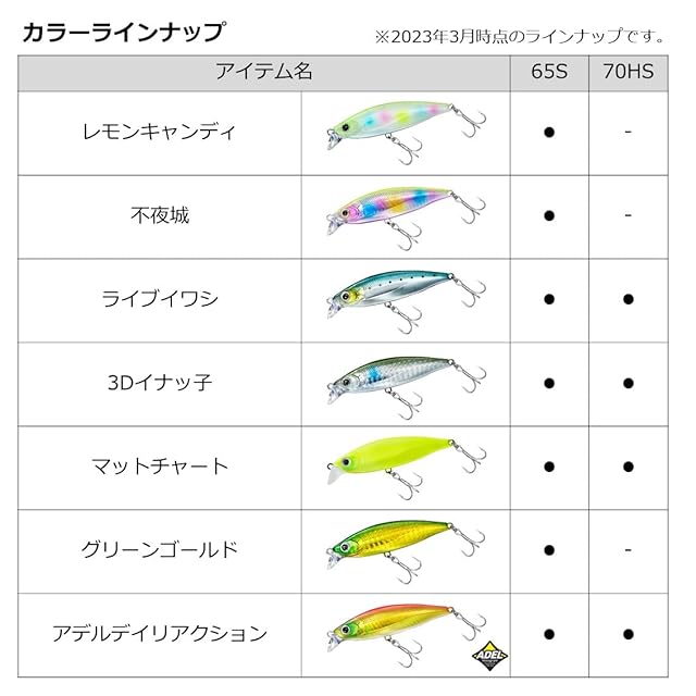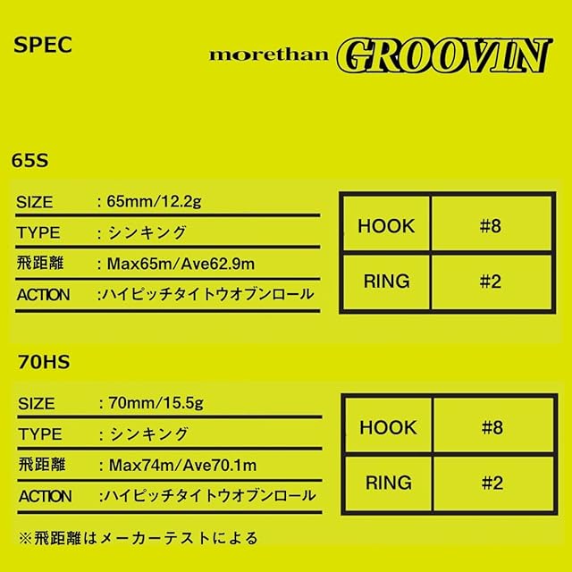 【タイプ】: 高比重コンパクトシンキングミノー【有効レンジ】: 高速時(65S:約20cm~50㎝、70HS:約50㎝~80㎝)/ スロー時(65S:約50㎝~150㎝、70HS:約70㎝~150㎝)