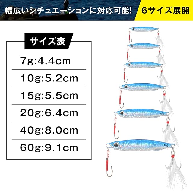 【サイズ展開】幅広いシチュエーションに対応可能!7g,10,15g,20g,40g,60gの6サイズ展開!