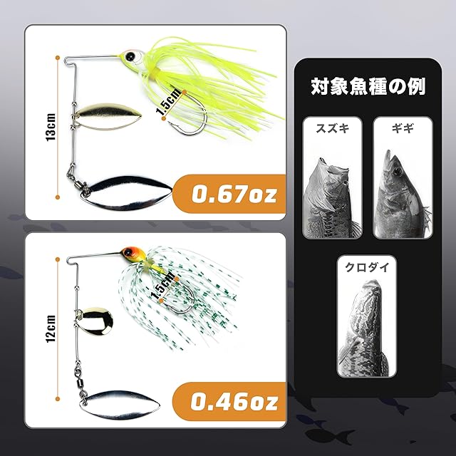 【主な対応魚種】ブラックバス、シーバス、ナマズ、アユとクロダイなどシーンで大活躍なスピナーベイトセットです。フロントブレードはシルバー色、リアブレードはゴールド色で、海釣り&淡水釣り、両方使用できます。
