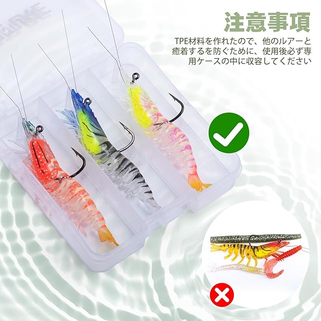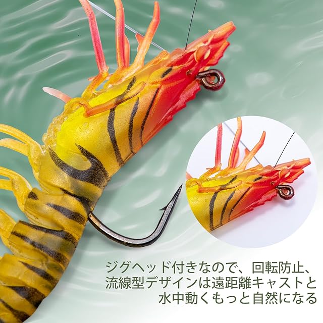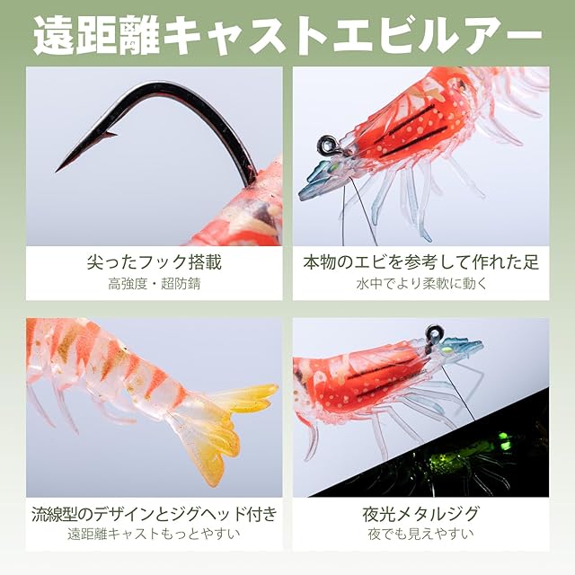 【夜釣りに適した】夜間使用時には、海老の目、内蔵のフックとビーズが発光し、夜釣りに威力を発揮できます。アングラーにとって、とても強力な相棒になるモノです。