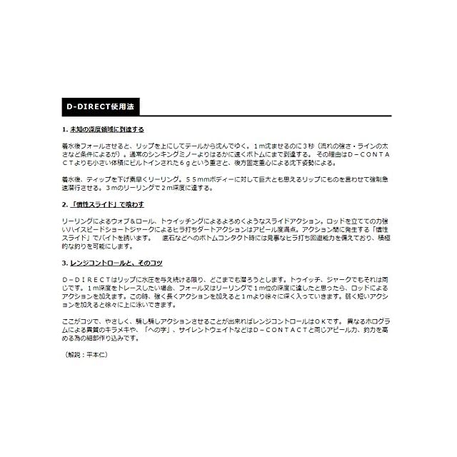 3.レンジコントロールと、そのコツ:D-DIRECTはリップに水圧を与え続ける限り、どこまでも潜ろうとします。トゥイッチ、ジャークでもそれは同じです。1m深度をトレースしたい場合、フォール又はリーリングで1m位の深度に達したと思ったら、ロッドによるアクションを加えます。この時、強く長くアクションを加えると1mより徐々に深く入っていきます。弱く短いアクションを加えると徐々に上に泳いできます。ここがコツで、やさしく、騙し騙しアクションさせることが出来ればレンジコントロールはOKです。