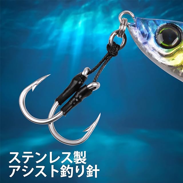 【素材と構造】メタルジグは鉛製で、頭にダブルアシストフックを装着しており、超シャープで強力なため、大型の肉食動物に素早く刺さり、ファイトできます。