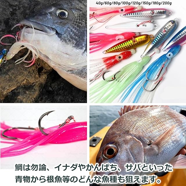 【幅広いターゲットを狙える万能ルアー】 青物 イナダ、カンパチ、ワラサ、サバなどの回遊魚中層~ボトム マダイ、タチウオ、シーバスなどのフィッシュイーター根魚 カサゴ、ハタ、ソイ、マゴチ、ヒラメなどのボトムターゲット 。これ1セットでさまざまな魚種に対応し、予想外の大物がヒットする驚きと興奮を味わえます!
