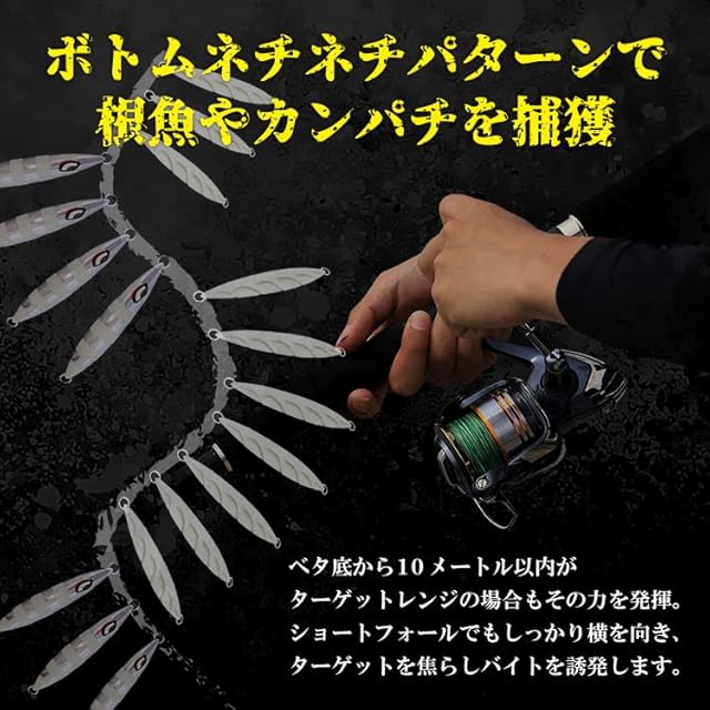 <ボトムネチネチパターンで根魚やカンパチを捕獲>ベタ底から10メートル以内がターゲットレンジの場合もその力を発揮。ショートフォールでもしっかり横を向き、ターゲットを焦らしバイトを誘発します。 <様々なターゲットにマッチする、釣果実績の多いカラーバリエーションを網羅>全国のアングラーから人気のカラーを厳選し、ハズレのないラインナップをご用意しております。
