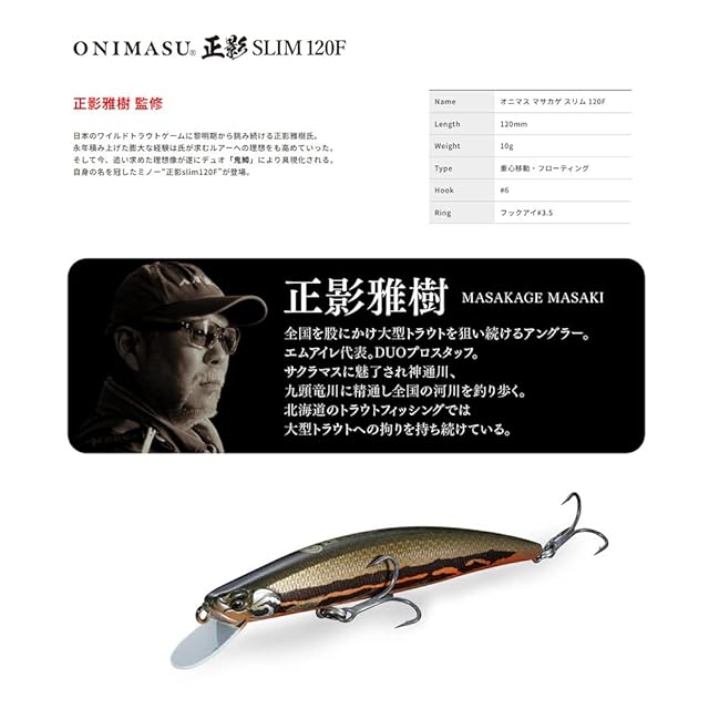 モデル:【鬼鱒 正影スリム 120F】……正影雅樹監修。求めたのは「流れ・瀬の中」の攻略!「スリムボディ+基板リップ」で、複雑な流れの中でも水を掴み・泳ぎ切る!
