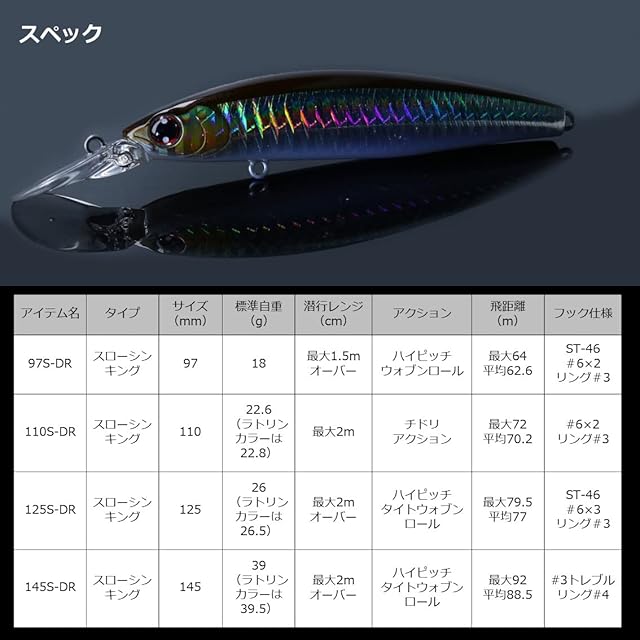 キャスタビリティ・レンジキープ性能を追求したスローシンキング設定ながら、多用するスロー~ミディアムでのレスポンスを徹底追求。小沼の卓越した経験とフィールドテストを繰り返した末にたどり着いた、こだわりの「釣れるハイピッチタイトウォブンロールアクション」が持ち味。「タダ巻きのスローリトリーブ」でもしっかりした引き心地と強烈なフラッシング&波動を発生。また、流れの変化で自動的に生まれるイレギュラースライドアクションが食わせの間を与え、特別なロッドアクションの入力は不要。低活性でシビアなシーバスのキスバイト(口先でつつくようなバイト)にも対応するこだわりの3本フックシステム採用。