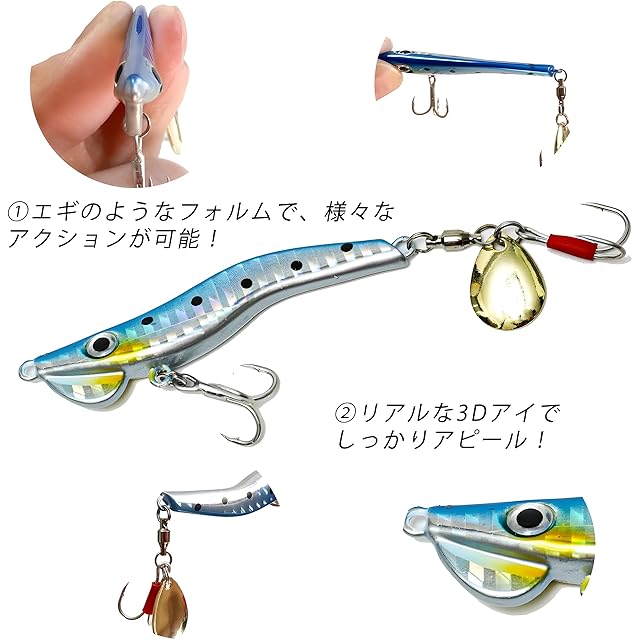 エギのような独特のフォルムであり、安定したフォーリング姿勢が特徴的 メタルジグと同様にメタルのソリッドボディでもあるため、表層からボトムまで全層を攻められる