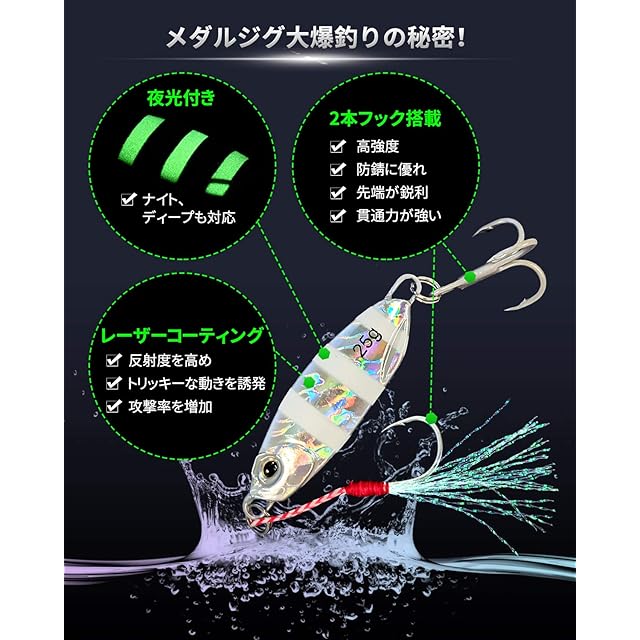 ✦【爆釣りし安い】メタルジグ表面は割れ、剥がれに強い5層の塗装、反射度を高め、鮮やかでリアルな姿で魚の注目を集めます。3 D立体魚眼設計で、より現実的で魚を刺激できます。鉛体は金属アンチモンを混ぜて、強度が高く、耐久性があり、変形しにくいです。