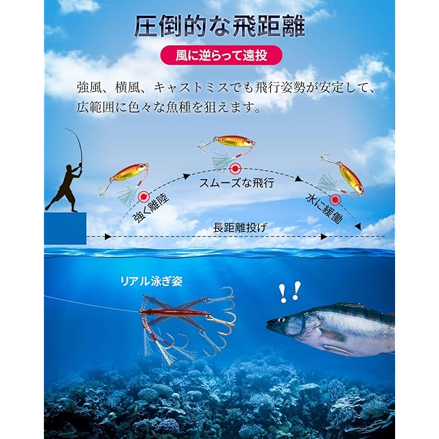✦【圧倒的な飛距離】ウエイトバランス設計で風の抵抗控えめ、長距離投げ、リアル泳ぎ姿、飛行姿勢が安定することができます。表層中層遊泳性魚類、淡水、海水釣りに適します。深海域で使用する場合でも、効率的な魚釣効果を発揮します。不可欠なハードルアー。