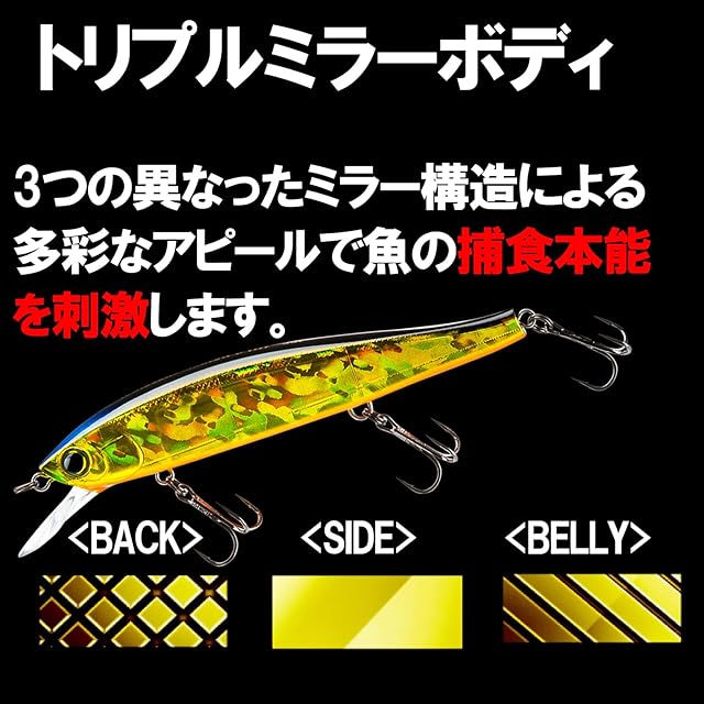 トリプルミラーボディ:3つの異なったミラー構造による多彩なアピールでブラックバスの捕食本能を刺激します。